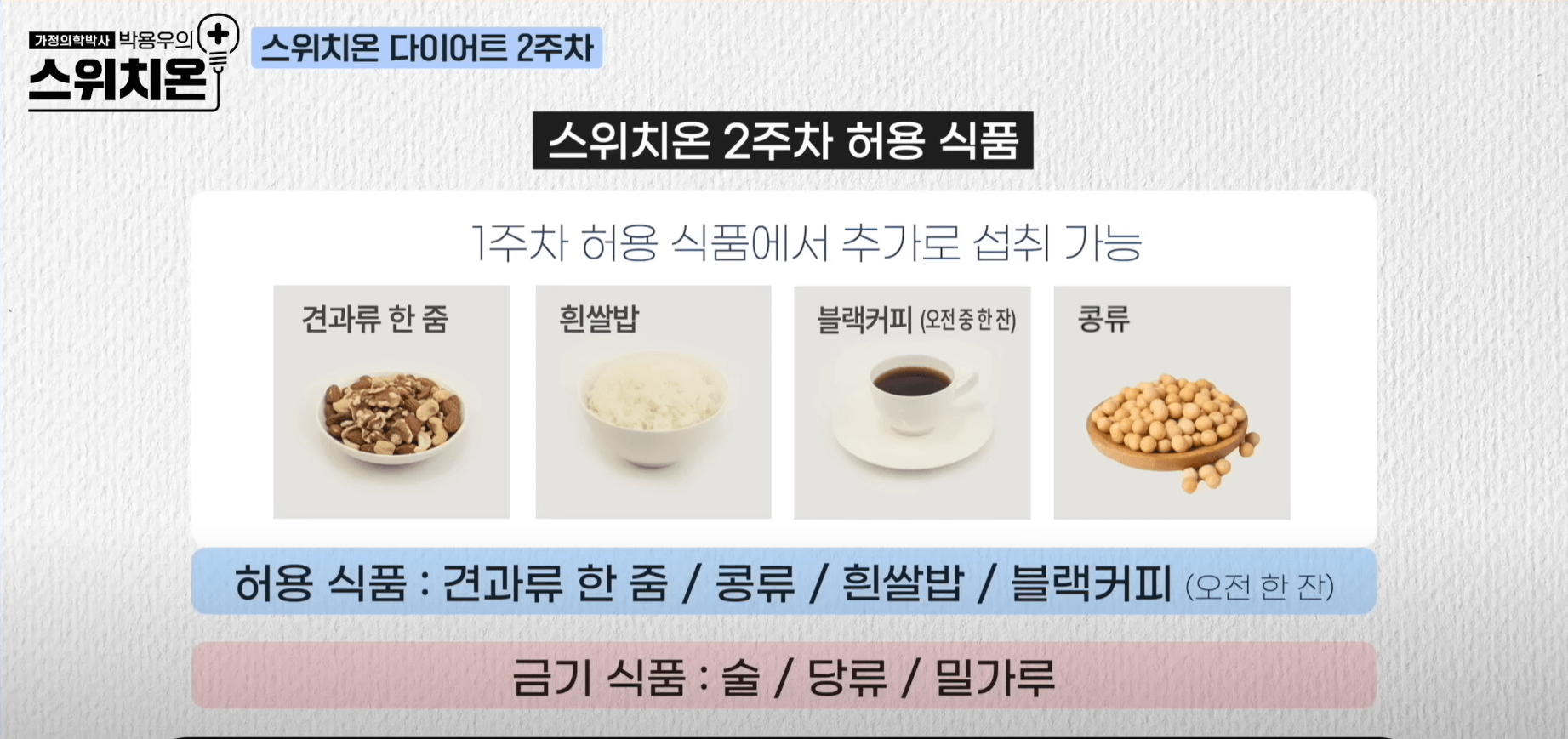 2주차 | - 위 허용식품 - 저녁 저탄수 식사 - 견과류 한 줌 - 낫또, 렌틸콩 |