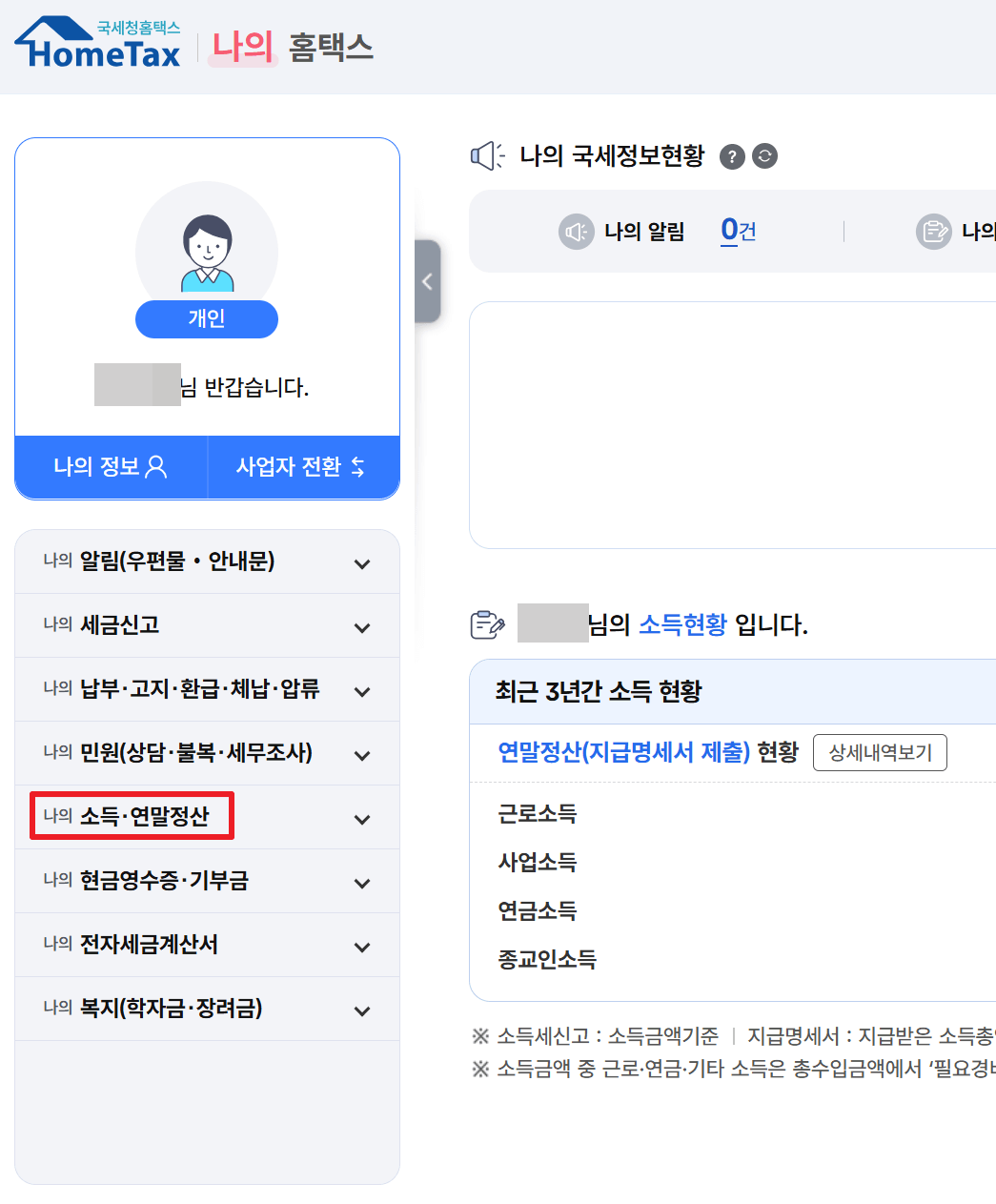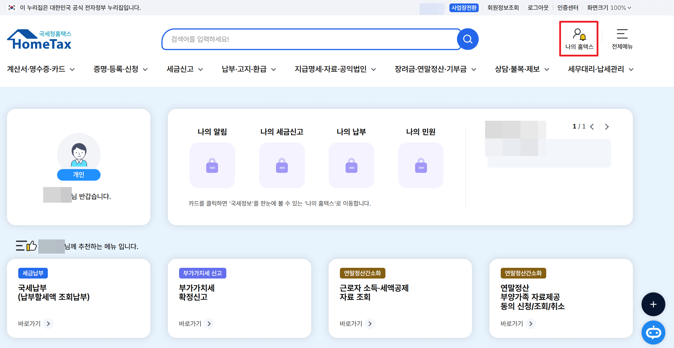 홈택스에 로그인 후 '나의 홈택스'에서 확인할 수 있습니다.