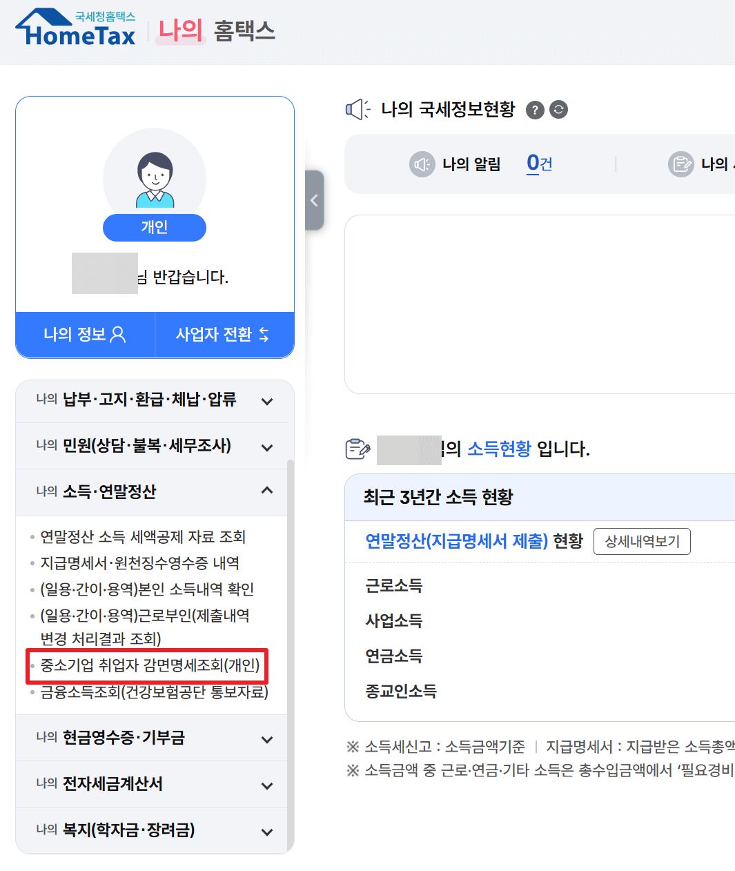 확인 경로 : 나의홈택스 - 나의 소득·연말정산 - 중소기업취업자 감면명세 조회